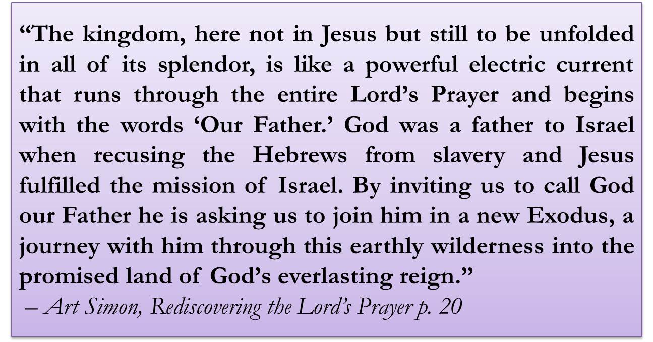 The words “Our Father,” don’t just acknowledge our intimacy with God. They are also packed with expectation of our coming future in God’s Kingdom. Art Simon, founder of Bread for the World and author of Rediscovering the Lord’s Prayer writes this:
